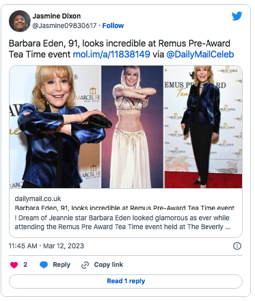 Her red carpet appearances are always a statement. At the Remus Pre-Award Tea Time event at The Beverly Hills Hotel, Eden dazzled in a navy satin blouse paired with black leggings, pointed heels, and black-and-silver jewelry, sparking admiration across social media for her ageless beauty.