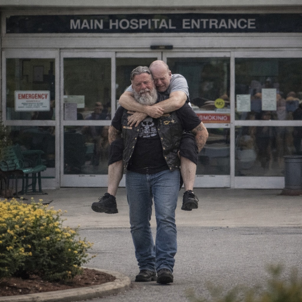 The first time Ray carried Michael into the hospital, people stared. A massive biker, gray beard, leather vest, carrying a grown man on his back like a child. Security came over—then froze when they saw Michael’s pale face. He had stage four colon cancer. Chemo was his only shot, but the treatments left him weaker than I’d ever seen.