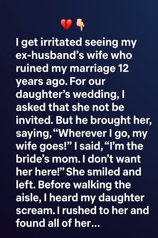 Twelve years after my marriage fell apart, I was still carrying the bitterness like a stone in my chest. My ex-husband’s wife — the woman I blamed for destroying everything — was the one face I refused to tolerate. So when my daughter’s wedding day approached, I made one request: she was not to be invited. This was my daughter’s day. I didn’t want old wounds turning it into a battlefield.