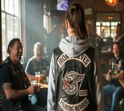 Before Cassie could respond, a Harley growled outside. Silence replaced the noise. The door opened. A broad-shouldered, bearded man stepped in—gray streaks in his hair, leather jacket adorned with faded patches. Across the back, the Iron Wolves emblem gleamed, with a tag that read Founding Member, 1971.