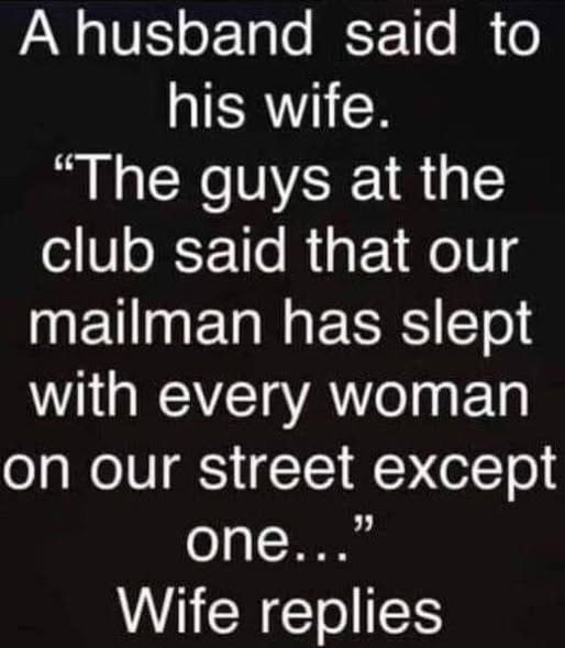 Leaning back in his chair, coffee mug in hand, he smirked and said, “You know, the guys at the club were saying the mailman’s slept with every woman on our street… except one.”