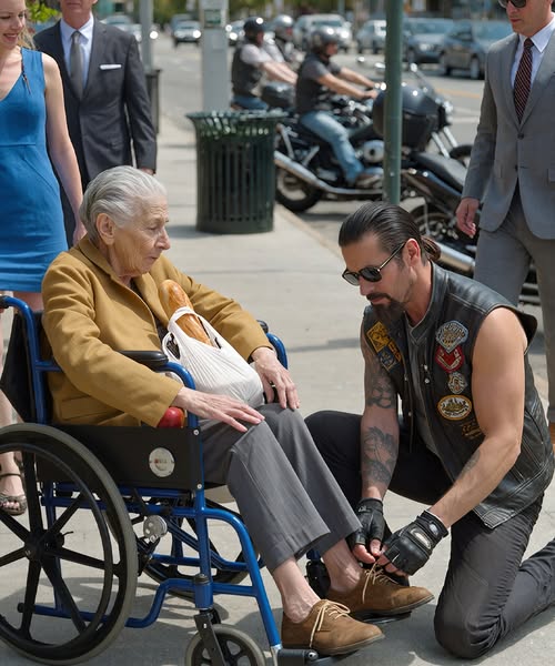 On a crowded sidewalk outside the pharmacy, her shoelaces came undone. Struggling to bend, she watched people pass by. Then a man in a leather vest appeared. He crouched, tied her shoes with surprising gentleness, and smiled.