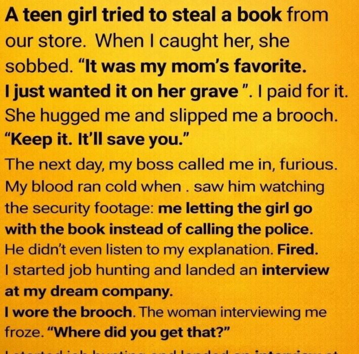 I chose understanding over confrontation. I purchased the book myself and returned it to her. She held it tightly, overwhelmed with gratitude, and quietly handed me a small silver flower brooch with a blue stone.