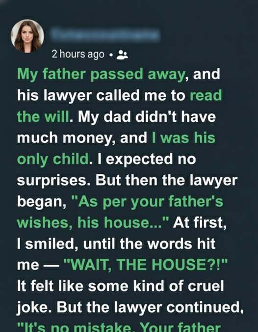 My father had been my entire world. After my mother died when I was very young, he became everything—provider, protector, comfort, and stability. Or so I believed. In his final years, reality began to crack that image. Medical bills piled up. Old debts resurfaced. The modest house we shared slipped toward foreclosure. By the time he passed, eviction notices were already taped to the door.