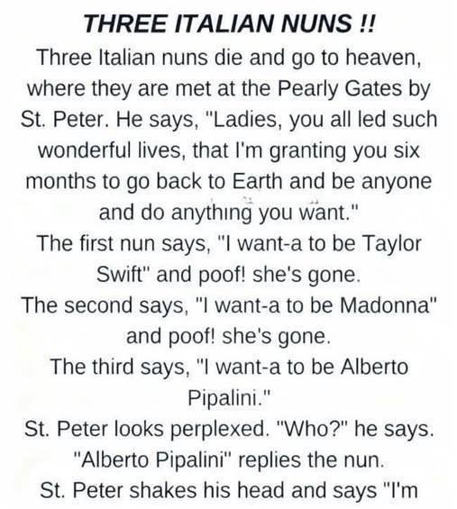 In the ethereal quietude of the afterlife’s threshold, where the clouds are sculpted with the precision of a Renaissance gallery and the light carries the warmth of a thousand sunsets, three Italian nuns found themselves standing before the Pearly Gates. They had arrived as they had lived: together, in a silent formation of grace and devotion. Their habits were crisp, their hands were tucked neatly into their sleeves, and their expressions bore the serene patience of women who had spent decades waiting upon the Lord. Throughout their long lives on Earth, they had been the foot soldiers of faith, the quiet laborers in hospitals and schools, the voices that rose in the pre-dawn chill to offer prayers for a world that often forgot to pray for itself.