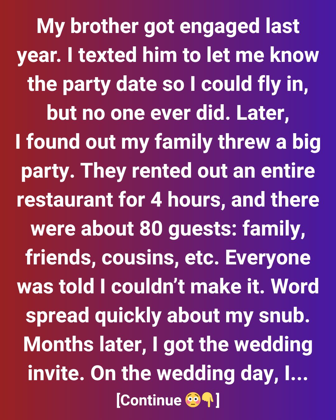 But then I found out the truth: it wasn’t a small dinner at all. My brother had rented out an entire restaurant. Eighty people were there—cousins, friends, extended family. Everyone was told I “couldn’t make it.” When my aunt texted me, disappointed I hadn’t come, I explained that I was never invited. Word spread, and my parents and brother backpedaled with weak excuses like “miscommunication” and “it’s just a party, no big deal.”