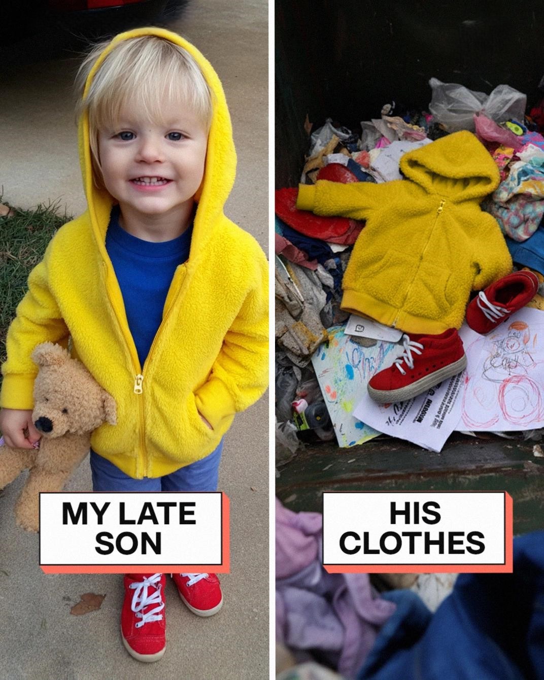 I ran to the garage — and there it was: a black trash bag, tied neatly. Inside were Caleb’s belongings — soaked and crumpled. His hoodie was stained, and his drawings ruined. I screamed until my voice broke. Ethan ran in, horrified.