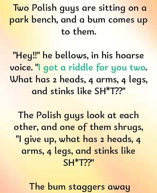 “Hey!! I got a riddle for you! What has 2 heads, 4 arms, 4 legs, and stinks like SH*T?”