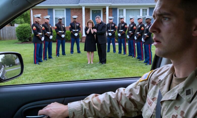 His home—blue shutters, familiar garden, the oak tree—was surrounded by soldiers in full dress uniform. A chaplain stood beside Emma, who wore a black dress and looked utterly devastated. Two soldiers held folded American flags.