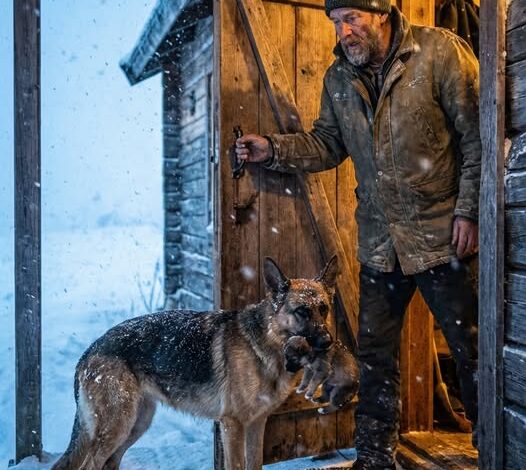A German Shepherd, black and gold, ice clinging to her fur, ribs visible. Her eyes locked on his—focused, exhausted, unwavering. In her mouth, something tiny. She stepped forward, dropped it at his feet: a puppy.
